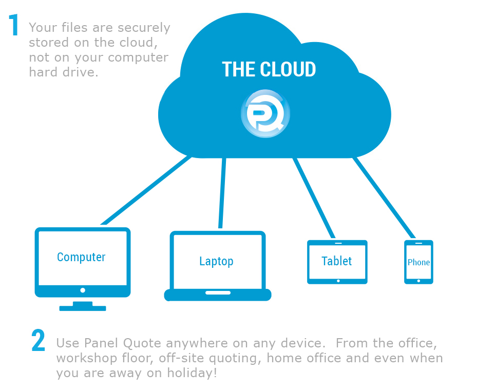 Put simply, a cloud based system means that your data is stored in an off-site, high security data centre. Because the data is not actually stored inside your computer, this offers you great flexibility. Let's say your computer dies or it is stolen, simply log back into Panel Quote with a new computer and all your business data is there for you completely unaffected. No more need for you to do backups! Panel Quote has been using cloud based technology since 2007 to provide a secure, reliable and flexible method for managing your business data.