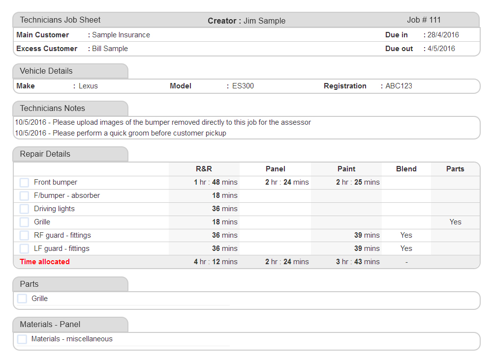 Panel Quote produces detailed yet easy to follow Job Sheets for staff members to perform repairs. These Job Sheets are driven by hourly rates that ensure the repair is completed in a timeframe that is profitable to the business.